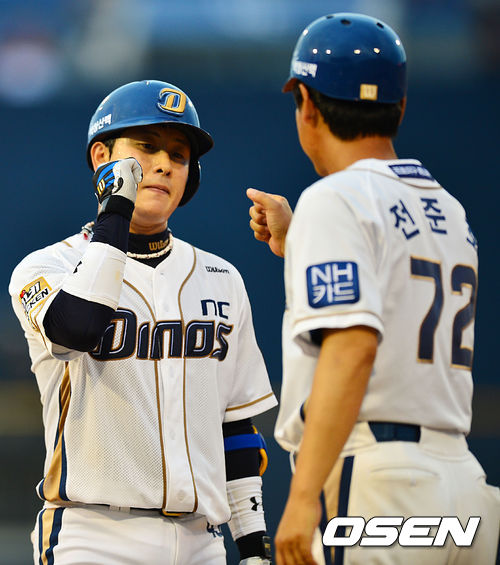 27일 오후 창원 마산야구장에서 열린 2013 한국야쿠르트 세븐프로야구 NC 다이노스와 KIA 타이거즈의 경기, 2회말 1사 주자 3루 NC 이태원이 좌익수 앞 1타점 적시타를 날린 후 1루에서 전준호 코치와 하이파이브를 하고 있다.