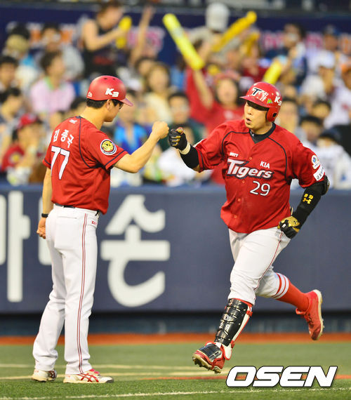 27일 오후 창원 마산야구장에서 열린 2013 한국야쿠르트 세븐프로야구 NC 다이노스와 KIA 타이거즈의 경기, 3회초 1사 주자 없는 상황에서 KIA 나지완이 좌월 솔로 홈런을 날린 후 3루에서 김종국 코치와 하이파이브를 하고 있다.