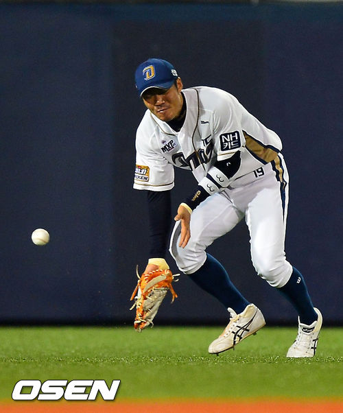 27일 오후 창원 마산야구장에서 열린 2013 한국야쿠르트 세븐프로야구 NC 다이노스와 KIA 타이거즈의 경기, 4회초 2사 주자 2루 KIA 김주찬이 좌익수 앞 역전 1타점 적시타때 NC 좌익수 박정준이 볼을 잡아내지 못하고 있다.