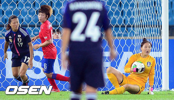 27일 오후 서울 잠실종합운동장에서 열린 2013 동아시안컵 축구선수권대회 한국과 일본의 경기 전반 김정미가 선방을 펼치고 있다.