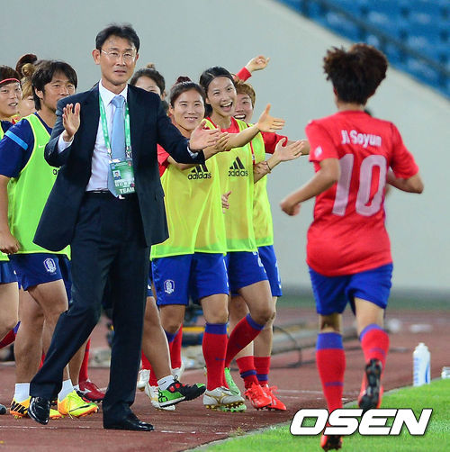 27일 오후 서울 잠실종합운동장에서 열린 2013 동아시안컵 축구선수권대회 한국과 일본의 경기 전반 지소연이 프리킥골을 넣은 후 윤덕여 감독에게 달려가고 있다.