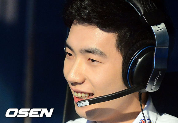 27일 오후 서울 용산 e스포츠 상설 경기장에서 열린 '핫식스 리그 오브 레전드 챔피언스(이하 롤챔스) 서머 2013' 16강 12회차 LG IM 2팀과 나진 화이트 실드 C조 경기, 1세트를 이긴 나진 화이트 정노철이 미소짓고 있다.