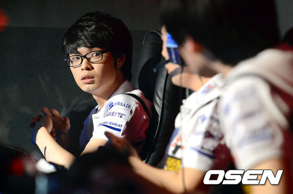 27일 오후 서울 용산 e스포츠 상설 경기장에서 열린 '핫식스 리그 오브 레전드 챔피언스(이하 롤챔스) 서머 2013' 16강 12회차 LG IM 2팀과 나진 화이트 실드 C조 경기, 나진 화이트 백영진이 동료들과 이야기를 나누고 있다.