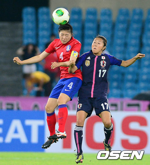 27일 오후 서울 잠실종합운동장에서 열린 2013 동아시안컵 축구선수권대회 한국과 일본의 경기 전반 심서연이 공중볼 다툼을 하고 있다.