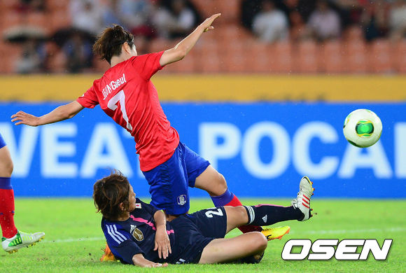 27일 오후 서울 잠실종합운동장에서 열린 2013 동아시안컵 축구선수권대회 한국과 일본의 경기 전반 전가을이 문전에서 슈팅기회를 놓치고 있다.