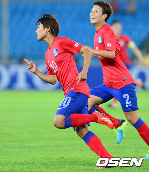 27일 오후 서울 잠실종합운동장에서 열린 2013 동아시안컵 축구선수권대회 한국과 일본의 경기 전반 지소연이 프리킥골을 넣은후 한국 벤치로 달려가고 있다.