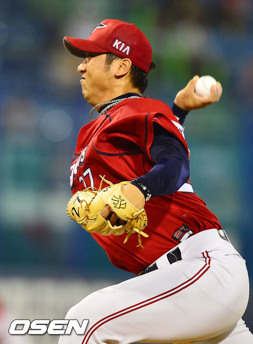 27일 오후 창원 마산야구장에서 열린 2013 한국야쿠르트 세븐프로야구 NC 다이노스와 KIA 타이거즈의 경기, 5회말 1사 주자 없는 NC 이호준 타석에서 마운드에 오른 KIA 신승현이 힘차게 공을 뿌리고 있다.