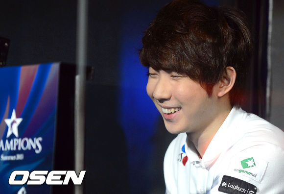 27일 오후 서울 용산 온게임넷 e스포츠 상설 경기장에서 열린 '핫식스 리그 오브 레전드 챔피언스(이하 롤챔스) 서머 2013' 16강 12회차 MiG 블리즈와 CJ 프로스트의 경기에 앞서 CJ 프로스트 박상면이 미소짓고 있다.