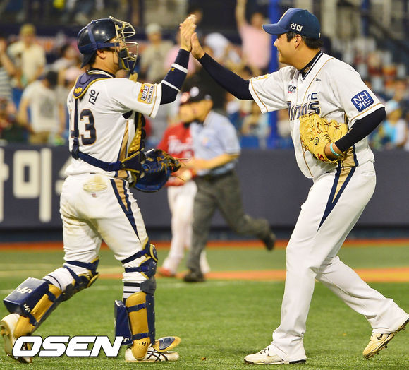 경기를 마치고 NC 이민호 투수와 이태원 포수가 하이파이브를 하고 있다. / rumi@osen.co.kr