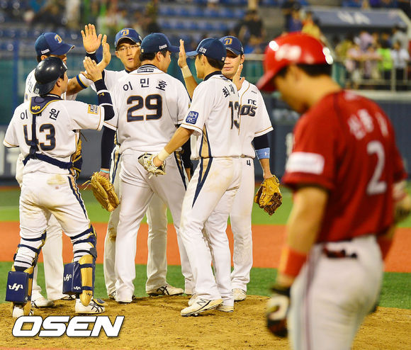 경기를 마치고 NC 선수들이 마운드 근처에 모여서 하이파이브를 하고 있다. / rumi@osen.co.kr