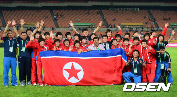 27일 오후 서울 잠실종합운동장에서 열린 2013 동아시안컵 축구선수권대회 한국과 일본의 경기 종료 후 북한 선수들이 기념촬영을 하고 있다.
