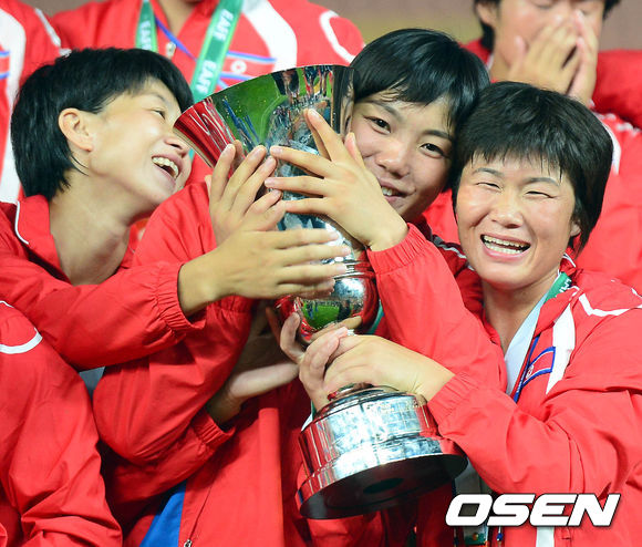 27일 오후 서울 잠실종합운동장에서 열린 2013 동아시안컵 축구선수권대회 한국과 일본의 경기 종료후 열린 시상식에서 북한 선수들이 우승 트로피를 들고 기뻐하고 있다.