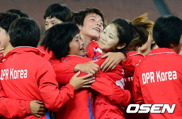 27일 오후 서울 잠실종합운동장에서 열린 2013 동아시안컵 축구선수권대회 한국과 일본의 경기 종료후 시상식에서 남북한 선수들이 포옹을 하고 있다.