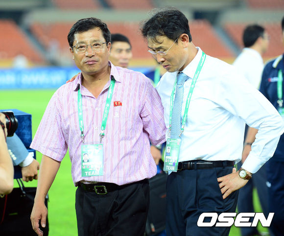 27일 오후 서울 잠실종합운동장에서 열린 2013 동아시안컵 축구선수권대회 한국과 일본의 경기 종료후 열린 시상식에서 북한 김광민 감독과 한국 윤덕여 감독이 어깨동무를 하고 이야기를 나누고 있다.