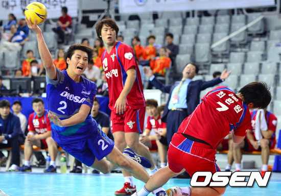 남자 핸드볼 2위 두산이 2013 SK핸드볼코리아리그 3라운드 전승의 휘파람을 불었다.