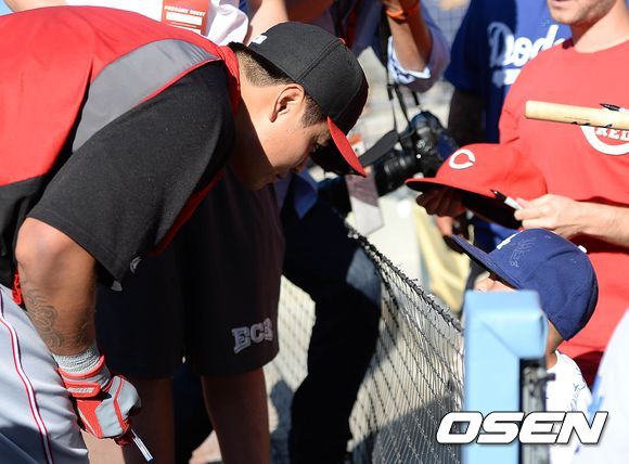 28일(한국시간) 미국 캘리포니아주 로스앤젤레스 다저스타디움에서 열린 2013 메이저리그 LA 다저스와 신시내티 레즈의 경기, 경기에 앞서 신시내티 추신수가 어린이 팬과 이야기를 나누고 있다.