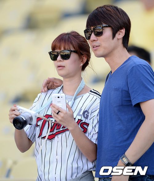 28일(한국시간) 미국 캘리포니아주 로스앤젤레스 다저스타디움에서 열린 2013 메이저리그 LA 다저스와 신시내티 레즈의 경기, 경기에 앞서 LG 유니폼을 입은 한국 관중들이 그라운드를 바라보고 있다.