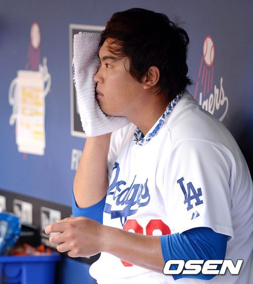 28일(한국시간) 미국 캘리포니아주 로스앤젤레스 다저스타디움에서 열린 2013 메이저리그 LA 다저스와 신시내티 레즈의 경기, 1회초 수비를 마친 류현진이 더그아웃에서 땀을 닦고 있다.