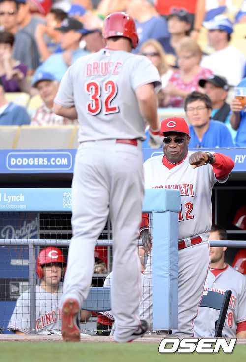 28일(한국시간) 미국 캘리포니아주 로스앤젤레스 다저스타디움에서 열린 2013 메이저리그 LA 다저스와 신시내티 레즈의 경기, 2회초 제이 브루스가 류현진으로부터 동점 솔로홈런을 치고 베이커 감독의 환영을 받고 있다.