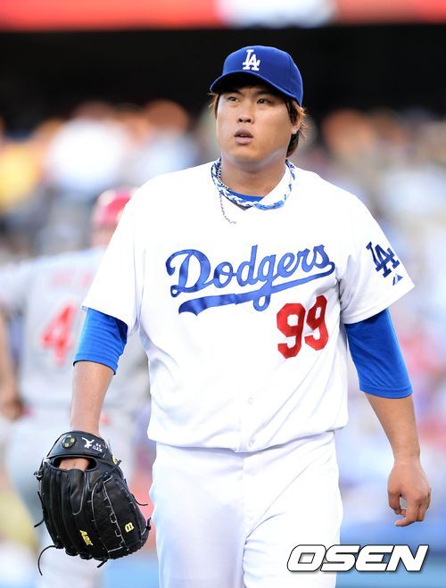 28일(한국시간) 미국 캘리포니아주 로스앤젤레스 다저스타디움에서 열린 2013 메이저리그 LA 다저스와 신시내티 레즈의 경기, 3회초 2사 류현진이 조이 보토를 삼진으로 잡고 더그아웃으로 가고 있다.