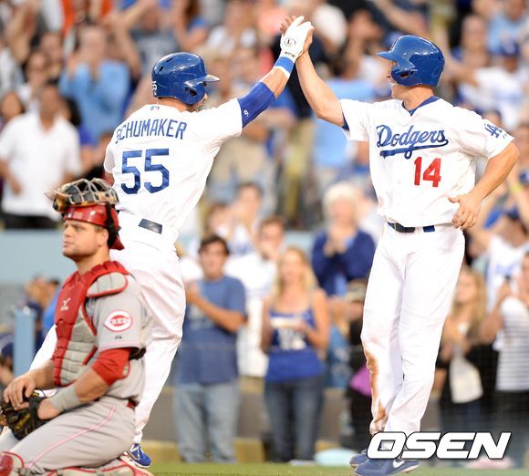 28일(한국시간) 미국 캘리포니아주 로스앤젤레스 다저스타디움에서 열린 2013 메이저리그 LA 다저스와 신시내티 레즈의 경기, 5회말 1사 2루 슈마커가 투런홈런을 치고 엘리스와 하이파이브를 하고 있다.