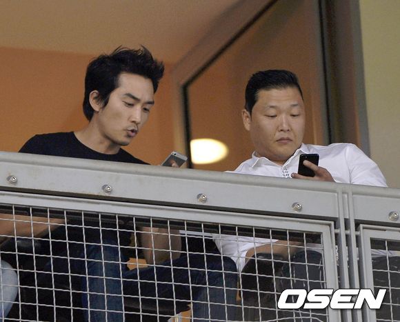28일(한국시간) 미국 캘리포니아주 로스앤젤레스 다저스타디움에서 열린 2013 메이저리그 LA 다저스와 신시내티 레즈의 경기, 송승헌과 싸이가 경기를 관전하다 휴대폰을 보고 있다.