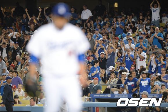 28일(한국시간) 미국 캘리포니아주 로스앤젤레스 다저스타디움에서 열린 2013 메이저리그 LA 다저스와 신시내티 레즈의 경기, 7이닝 1실점 9탈삼진 호투한 류현진에게 다저스 팬들이 기립박수를 보내고 있다. 방어율을 3.14로 낮아졌다.