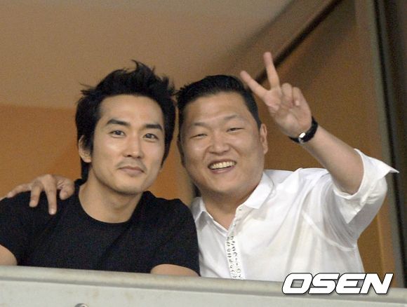 송승헌과 싸이가 경기중 취재진을 향해 포즈를 취하고 있다. /sunday@osen.co.kr