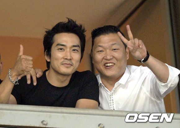 류현진 추신수 맞대결 경기를 관전 온 송승헌과 싸이가 취재진을 위해 포즈를 취하고 있다. /sunday@osen.co.kr