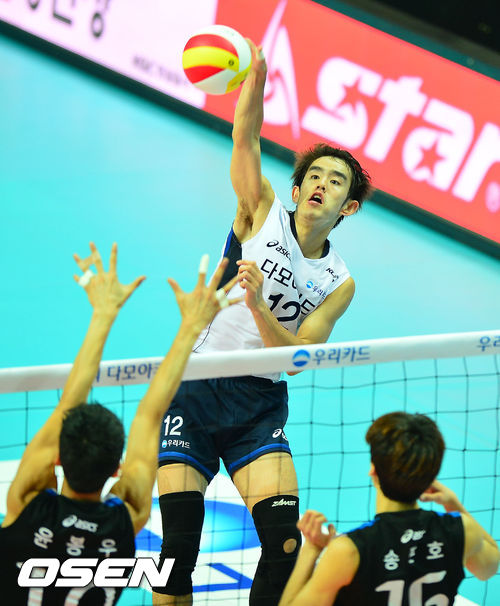 28일 오후 경기도 안산시 상록수체육관에서 열린 '2013 안산-우리카드컵 프로배구대회' 남자부 결승 현대캐피탈과 우리카드의 경기, 우리카드 신으뜸이 강타를 날리고 있다.