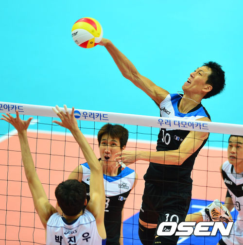 28일 오후 경기도 안산시 상록수체육관에서 열린 '2013 안산-우리카드컵 프로배구대회' 남자부 결승 현대캐피탈과 우리카드의 경기, 현대캐피탈 윤봉우가 강타를 날리고 있다.