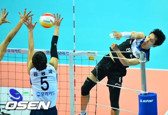 28일 오후 경기도 안산시 상록수체육관에서 열린 '2013 안산-우리카드컵 프로배구대회' 남자부 결승 현대캐피탈과 우리카드의 경기, 현대캐피탈 박주형이 강타를 날리고 있다.