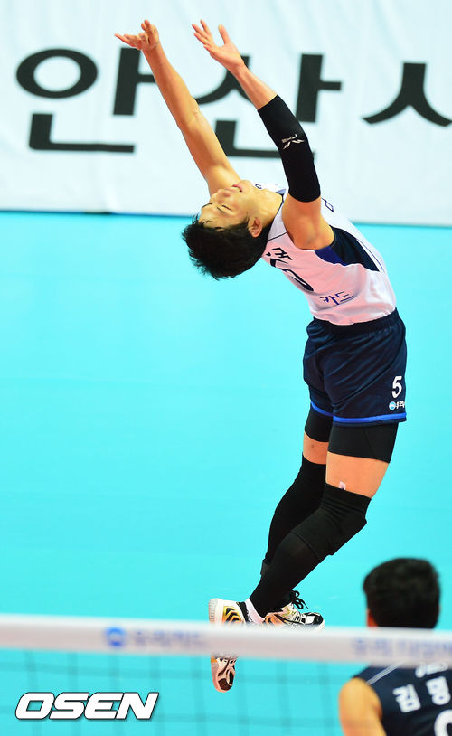 28일 오후 경기도 안산시 상록수체육관에서 열린 '2013 안산-우리카드컵 프로배구대회' 남자부 결승 현대캐피탈과 우리카드의 경기, 우리카드 김광국이 볼을 받아내고 있다.