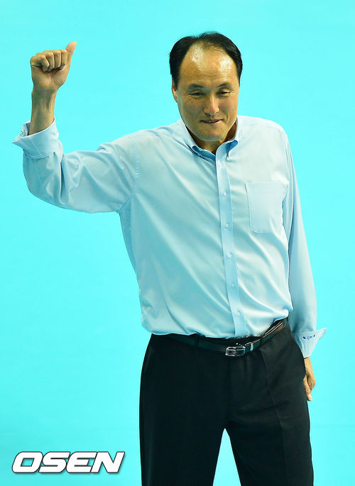 28일 오후 경기도 안산시 상록수체육관에서 열린 '2013 안산-우리카드컵 프로배구대회' 남자부 결승 현대캐피탈과 우리카드의 경기, 우리카드 강만수 감독이 주먹을 쥐고 있다.