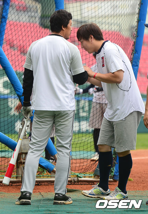 28일 오후 서울 잠실구장에서 열리는 '2013 한국야쿠르트 세븐 프로야구' 두산 베어스와 LG 트윈스의 경기에 앞서 두산 김현수가 LG 이병규의에게 인사를 한 뒤 배트를 뺏으려하고 있다.