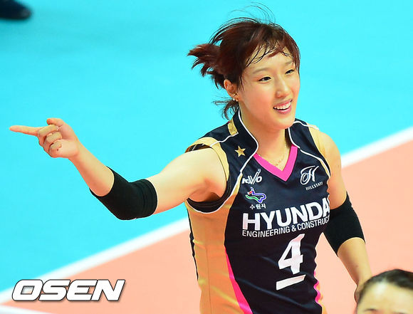 28일 오후 경기도 안산시 상록수체육관에서 열린 '2013 안산-우리카드컵 프로배구대회' 여자부 결승 현대건설-IBK기업은행 경기,현대건설 황연주가 공격에 성공한 후 기뻐하고 있다.