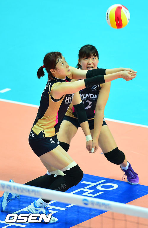 28일 오후 경기도 안산시 상록수체육관에서 열린 '2013 안산-우리카드컵 프로배구대회' 여자부 결승 현대건설-IBK기업은행 경기,현대건설 황연주가 볼을 받아내고 있다.