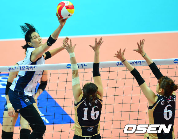 28일 오후 경기도 안산시 상록수체육관에서 열린 '2013 안산-우리카드컵 프로배구대회' 여자부 결승 현대건설-IBK기업은행 경기,IBK기업은행 김희진이 연타를 넣고 있다.