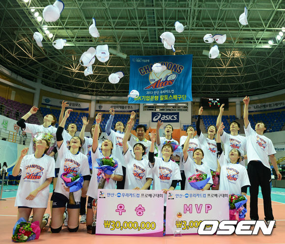 IBK기업은행은 28일 안산상록수체육관에서 열린 2013 안산우리카드컵 프로배구대회 여자부 결승전서 현대건설을 3-0(25-20, 25-13, 25-17)으로 완파하고 정상에 올랐다. IBK기업은행의 '좌우 쌍포' 김희진과 박정아는 각 20점, 16점을 올리며 우승의 일등공신이 됐다.