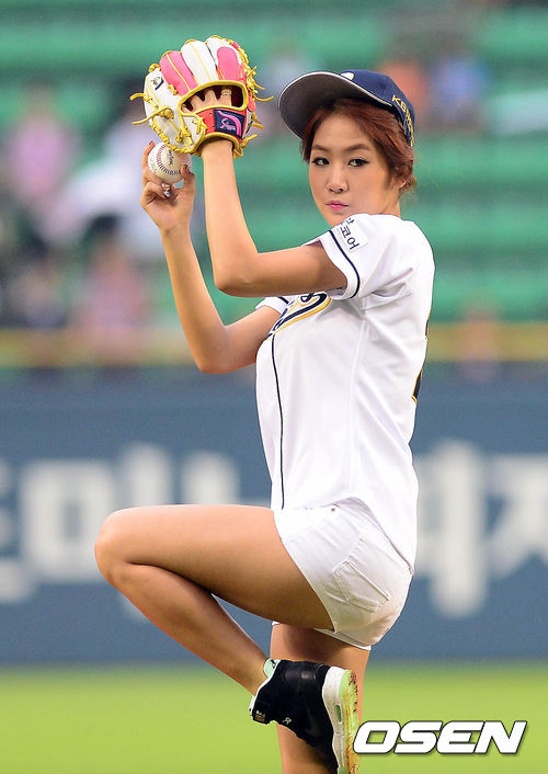 28일 오후 서울 잠실구장에서 열린 '2013 한국야쿠르트 세븐 프로야구' 두산 베어스와 LG 트윈스의 경기 시작전 씨스타 소유가 시구를 하고 있다.