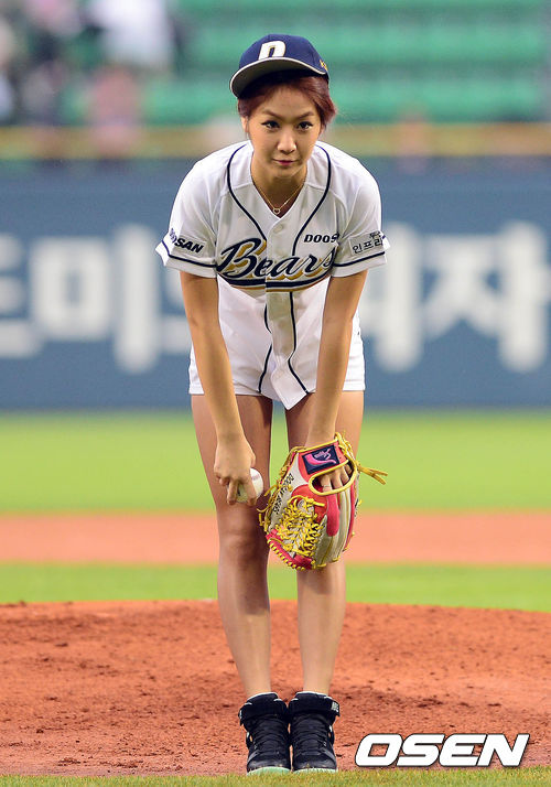 28일 오후 서울 잠실구장에서 열린 '2013 한국야쿠르트 세븐 프로야구' 두산 베어스와 LG 트윈스의 경기 시작전 씨스타 소유가 시구를 하고 있다.