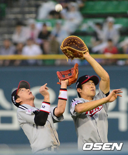 28일 오후 서울 잠실구장에서 열린 '2013 한국야쿠르트 세븐 프로야구' 두산 베어스와 LG 트윈스의 경기 2회말 2사 3루 이원석의 뜬공을 문선재가 잡고 있다.