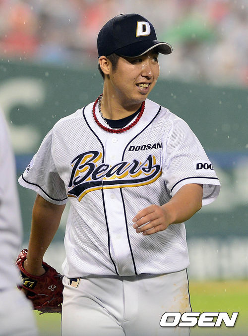28일 오후 서울 잠실구장에서 열린 '2013 한국야쿠르트 세븐 프로야구' 두산 베어스와 LG 트윈스의 경기 5회초를 마친 유희관이 미소를 지으며 덕아웃으로 향하고 있다.