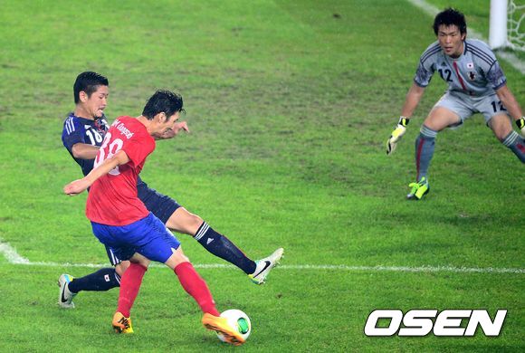 [OSNE=잠실, 지형준 기자] 28일 오후 서울 잠실종합운동장에서 열린 2013 동아시안컵 축구선수권대회 한국과 일본의 경기, 전반 한국 김동섭이 슛을 시도하고 있다.