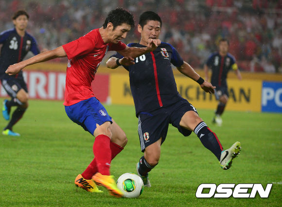 [OSNE=잠실, 곽영래 기자] 28일 오후 서울 잠실종합운동장에서 열린 2013 동아시안컵 축구선수권대회 한국과 일본의 경기 전반 한국 김동섭이 슈팅을 때리고 있다.