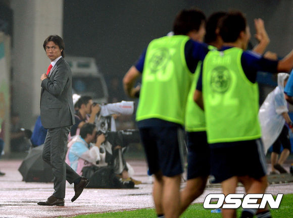 [OSNE=잠실, 곽영래 기자] 28일 오후 서울 잠실종합운동장에서 열린 2013 동아시안컵 축구선수권대회 한국과 일본의 경기 전반 한국 홍명보 감독이 선제골을 넣고 기뻐하는 일본 선수들을 바라보고 있다.