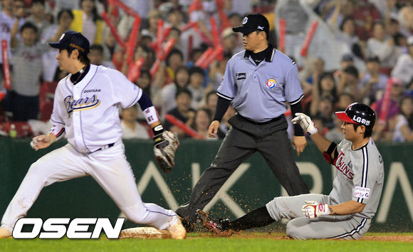 28일 오후 서울 잠실구장에서 열린 '2013 한국야쿠르트 세븐 프로야구' 두산 베어스와 LG 트윈스의 경기 8회초 2사 오지환이 우익수 오른쪽 3루타를 치고 3루에서 세이프되고 있다.