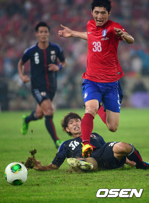 [OSNE=잠실, 곽영래 기자] 28일 오후 서울 잠실종합운동장에서 열린 2013 동아시안컵 축구선수권대회 한국과 일본의 경기 전반 한국 김동섭이 일본 수비수의 태클을 피해 돌파를 시도하고 있다.