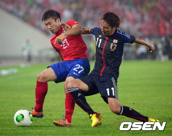[OSNE=잠실, 곽영래 기자] 28일 오후 서울 잠실종합운동장에서 열린 2013 동아시안컵 축구선수권대회 한국과 일본의 경기 전반 한국 고요한이 볼 다툼을 하고 있다.