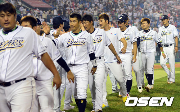 28일 오후 서울 잠실구장에서 열린 '2013 한국야쿠르트 세븐 프로야구' 두산 베어스와 LG 트윈스의 경기 종료 후 두산 선수들이 하이파이브를 하고 있다.